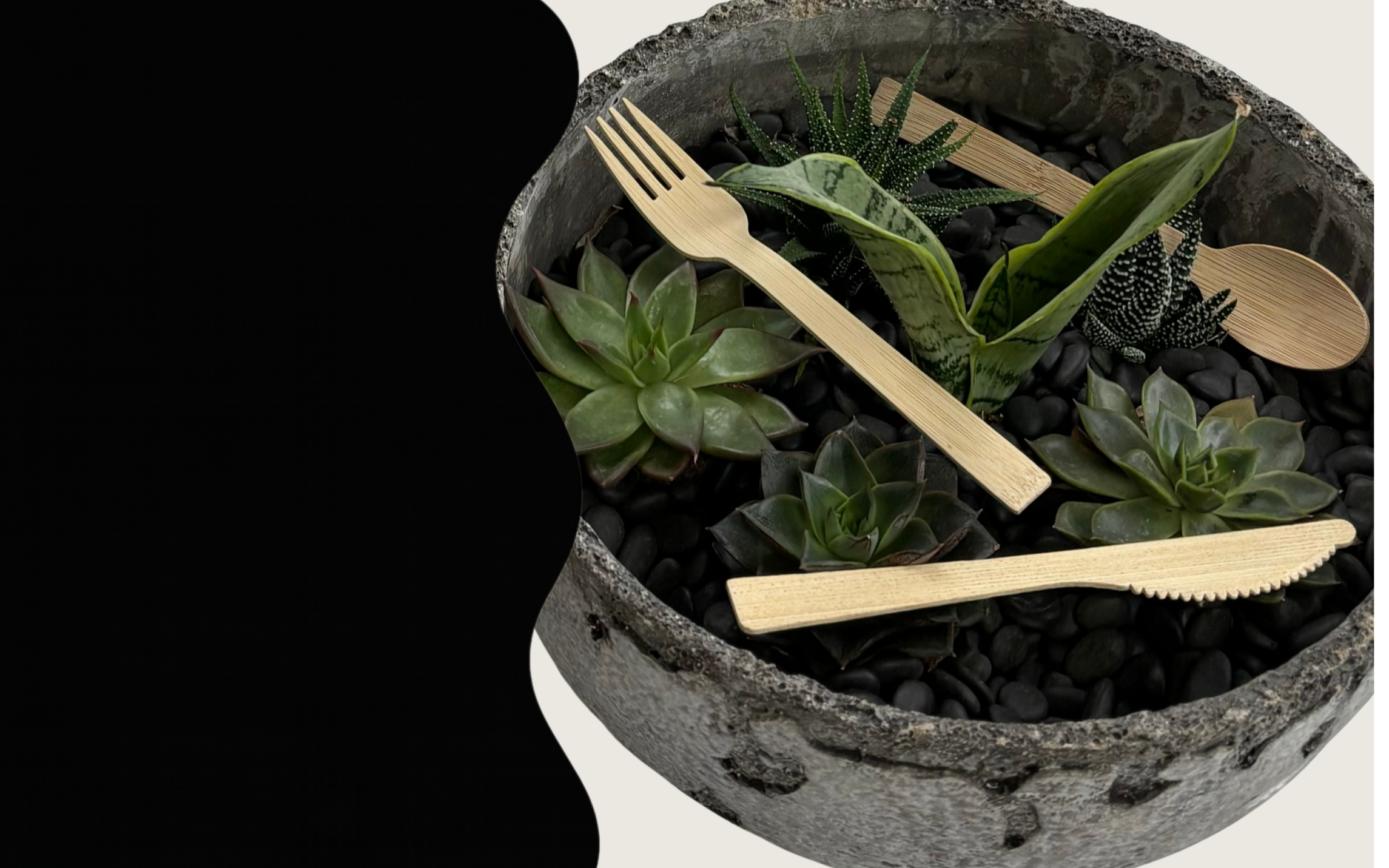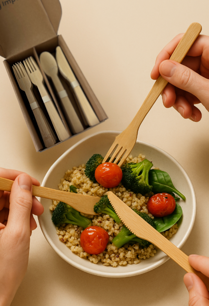 We only use 100% natural, chemical-free bamboo — no coatings, no bioplastic blends, no shortcuts. That means every fork, knife, and spoon is strong, smooth, truly compostable and doesn't leave that "woody taste" in your mouth. It looks elevated, feels sturdy, and breaks down naturally. Good for your table. Great for the planet.